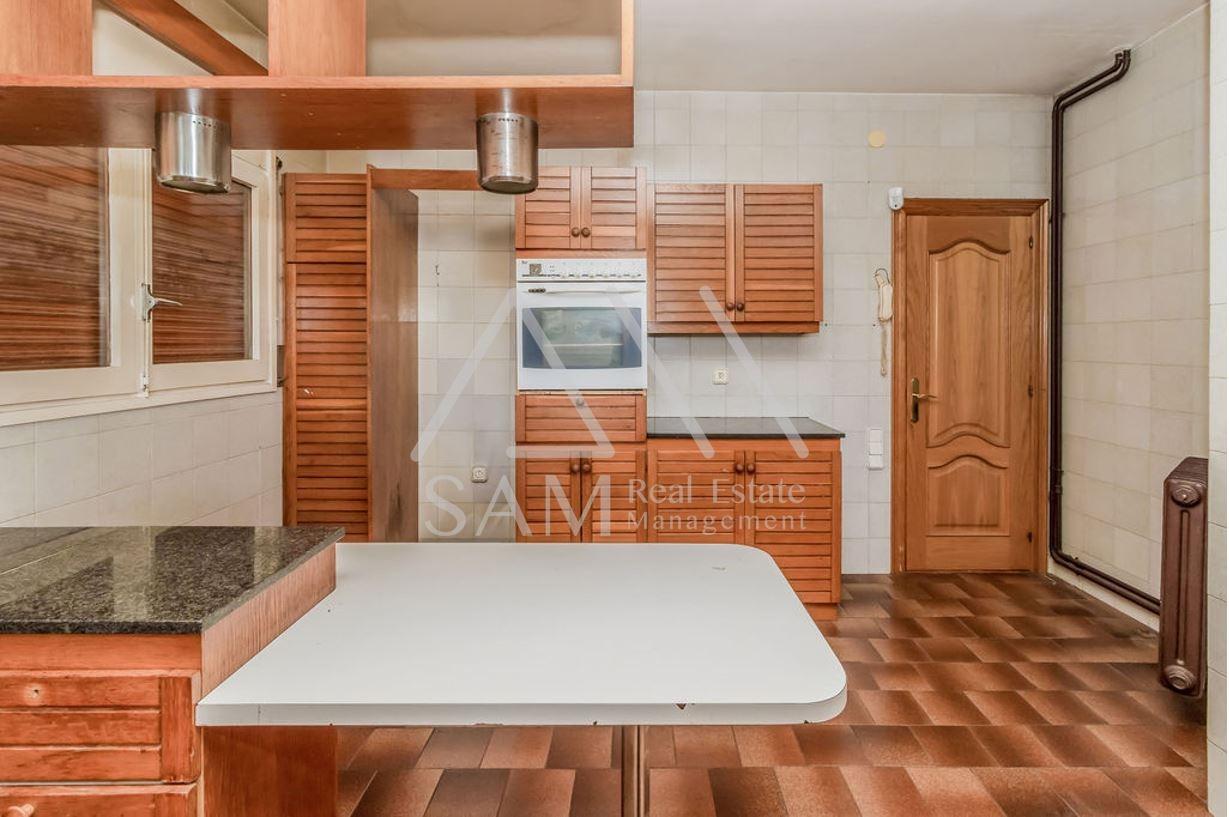 Una cocina amueblada, equipada con armarios altos y bajos para optimizar el espacio de almacenamiento.